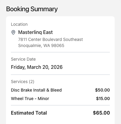 Customers book tune-ups, repairs, and fittings directly from your website — picking their preferred date, location, and service type. You get organized bookings instead of phone tag.