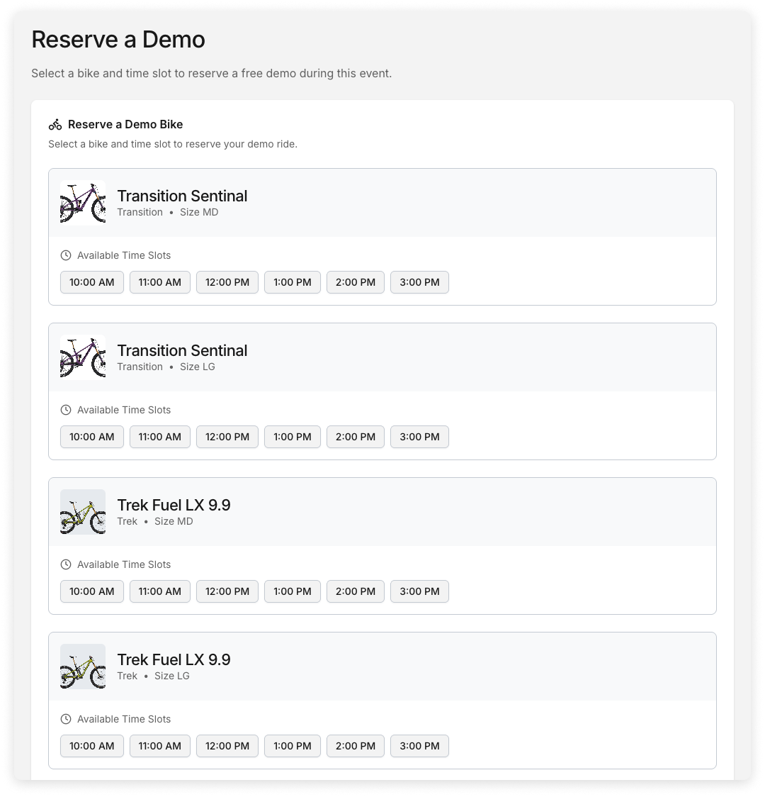 Shop rides, demo days, clinics, and group events — customers register, sign waivers, and reserve demo bikes online. Waitlists and capacity limits are built in, so you stay organized without the back-and-forth.