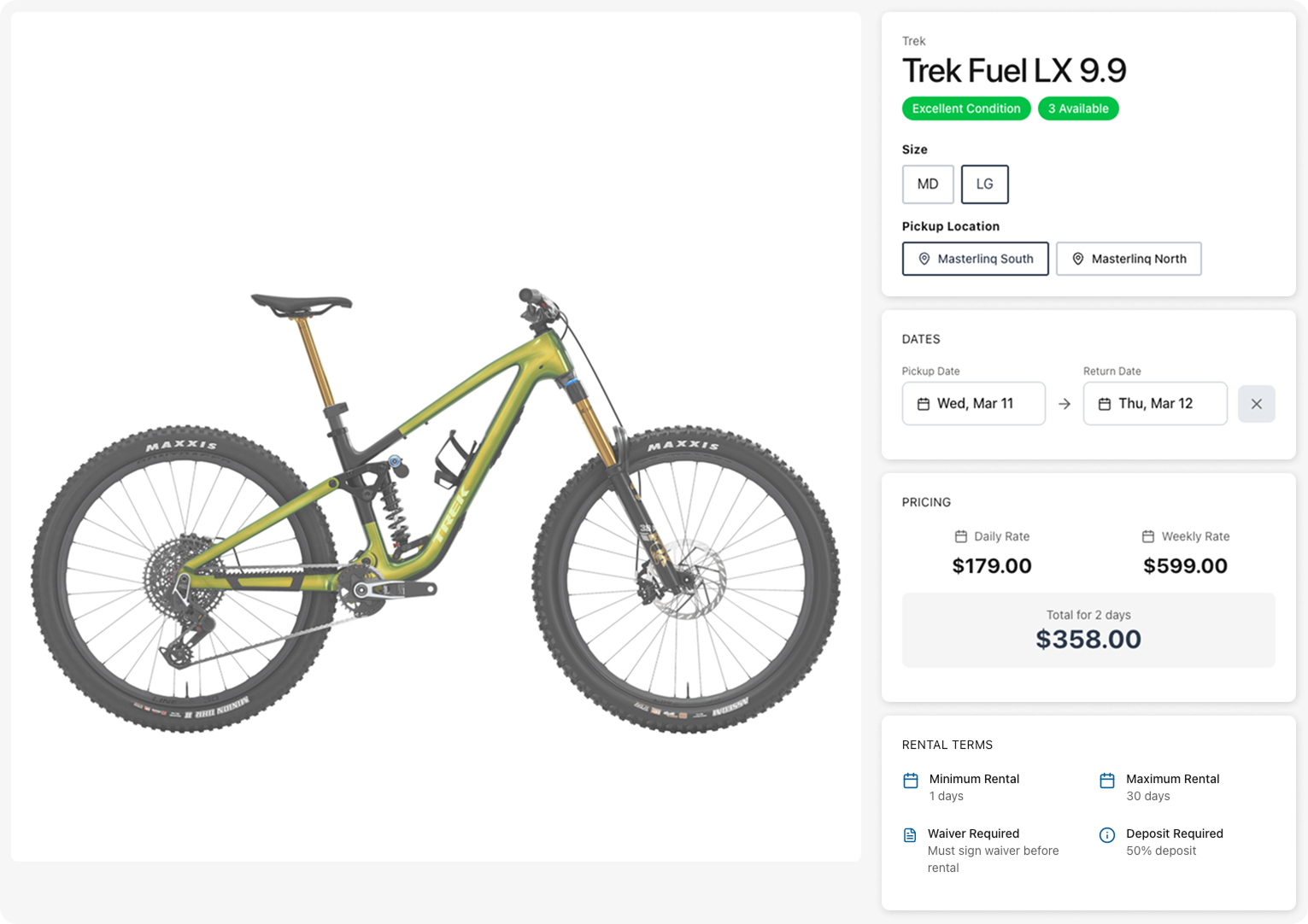 Customers browse available bikes and gear, pick their dates, and book online. Size-based inventory, deposits, and waivers are handled automatically — so you spend less time on paperwork and more time getting people riding.