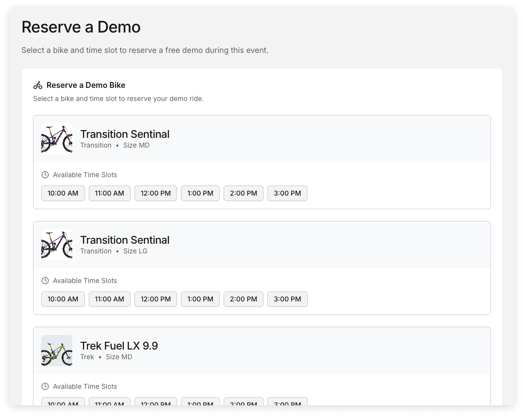 Shop rides, demo days, clinics, and group events — customers register, sign waivers, and reserve demo bikes online. Waitlists and capacity limits are built in, so you stay organized without the back-and-forth.