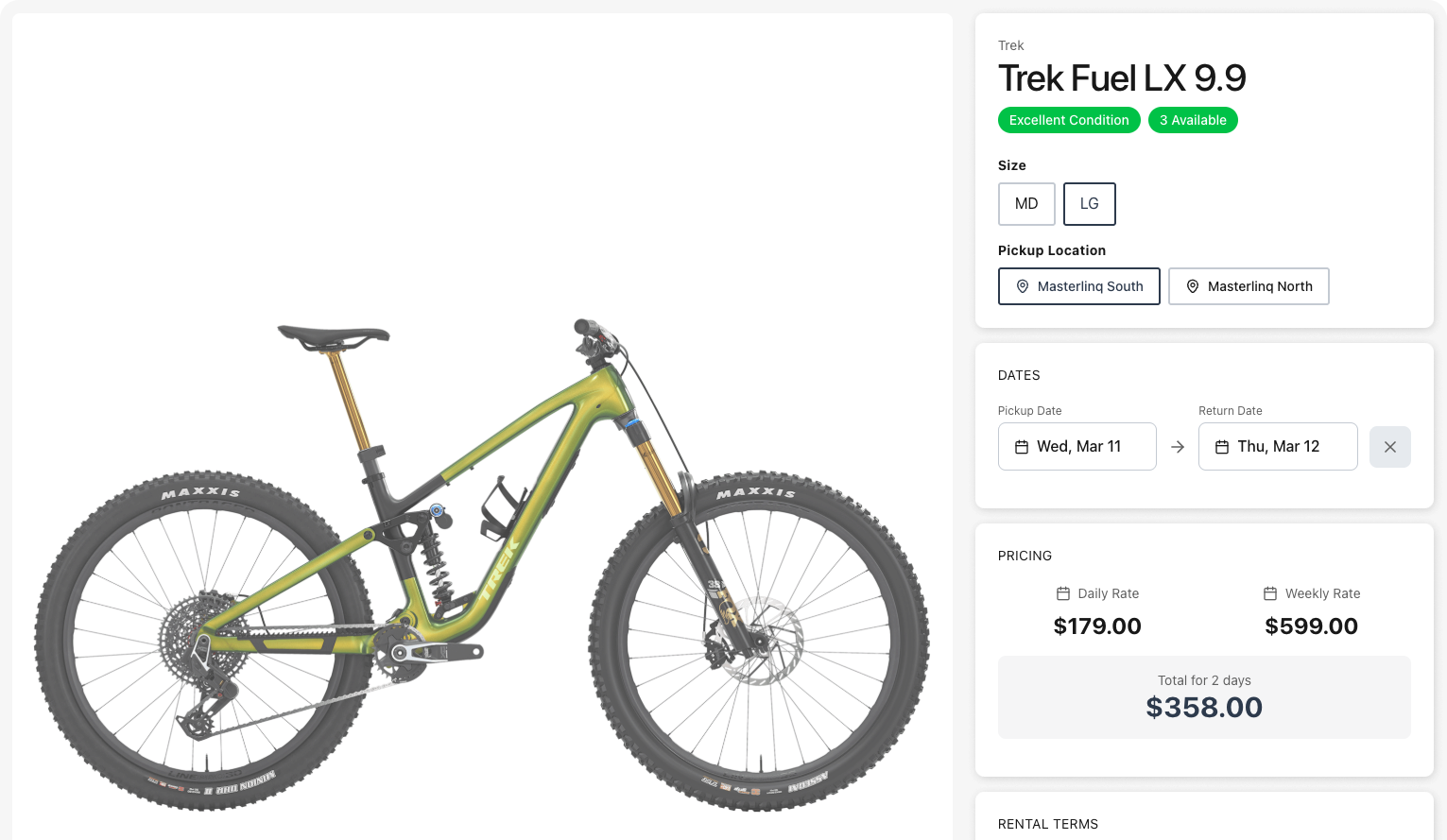 Customers browse available bikes and gear, pick their dates, and book online. Size-based inventory, deposits, and waivers are handled automatically — so you spend less time on paperwork and more time getting people riding.