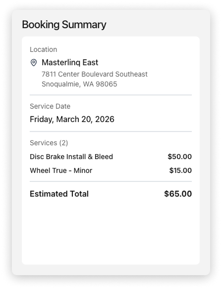 Customers book tune-ups, repairs, and fittings directly from your website — picking their preferred date, location, and service type. You get organized bookings instead of phone tag.